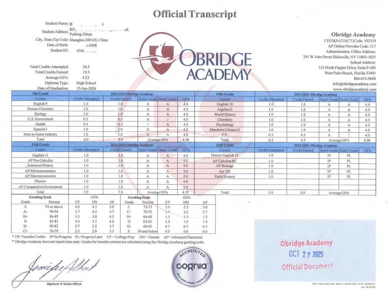从9年级到12年级,四年磨一剑。H同学的学术轨迹清晰有力,不仅保持了优异的成绩,更勇敢地挑战了多门AP和荣誉课程,这份学术实力与坚持,正是打动梦校的关键。