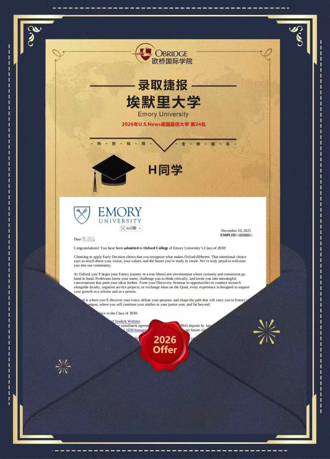 恭喜Obridge Academy上海学员H同学,以4.23的出色GPA,通过Early Decision成功锁定美国顶尖名校——埃默里大学(Emory University)牛津学院的2030届席位!